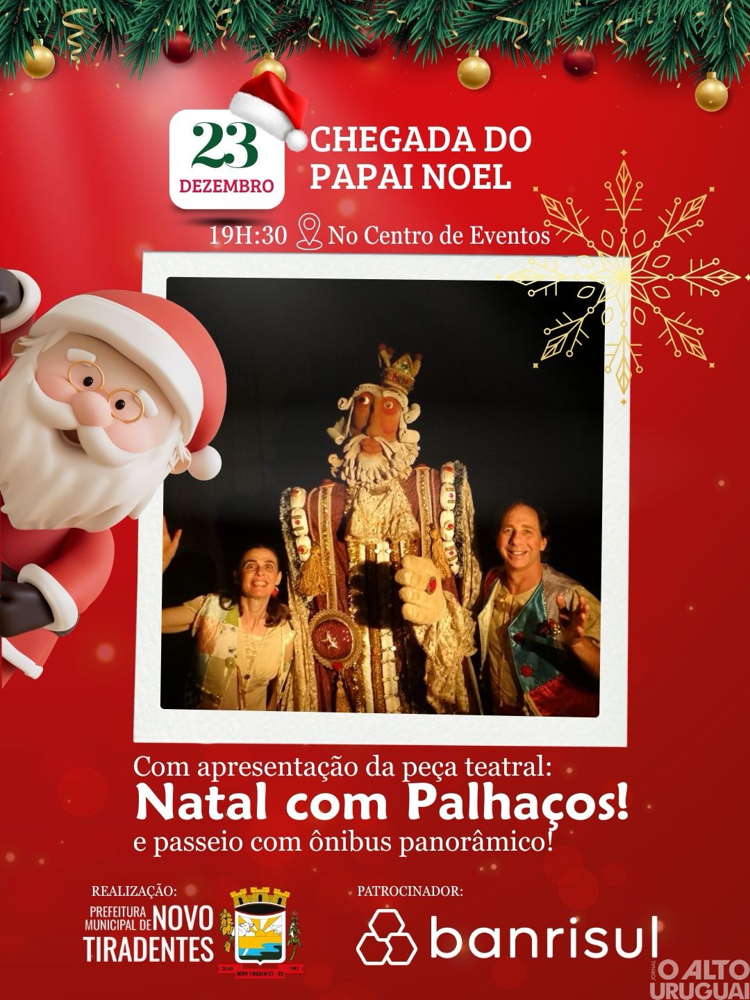 A magia do Natal continua iluminando Novo Tiradentes! Nesta terça-feira, 23 de dezembro, a partir das 19h30min, no Centro de Eventos, a comunidade está convidada a viver uma noite especial com a Chegada do Papai Noel, dentro da programação do já tradicional “Um Show de Natal”.