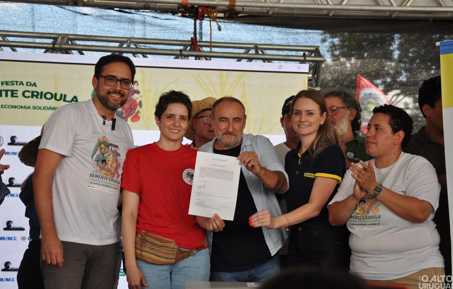 A Fundação Banco do Brasil assinou convênio com a Cooperativa Mista de Produção, Industrialização e Comercialização de Biocombustíveis do Brasil (Cooperbio) para fortalecer iniciativas de produção agroecológica no Rio Grande do Sul. O investimento de R$ 1,8 milhão integra o projeto “Ecoforte Redes: Estruturação e Fortalecimento da Rede Alimergia”. A solenidade ocorreu durante a 9ª Festa da Semente Crioula e 4ª Feira da Economia Solidária, realizada no último sábado, 14, em Seberi. O evento reuniu agricultores familiares, organizações sociais, pesquisadores e representantes de instituições públicas.