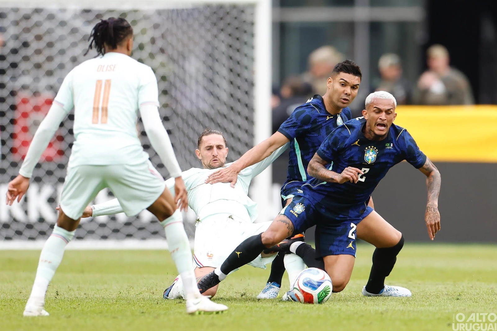 Mesmo com uma postura mais defensiva, a qualidade dos franceses se sobressaía e o Brasil pouco criava e tinha dificuldades de implantes a sua estratégia. O planejamento mais conservador caiu por terra quando o atual melhor jogador do mundo, Dembelé, acionou o craque Mbappé, que cara a cara com Ederson, deu um toque de cavadinha para abrir o placar.